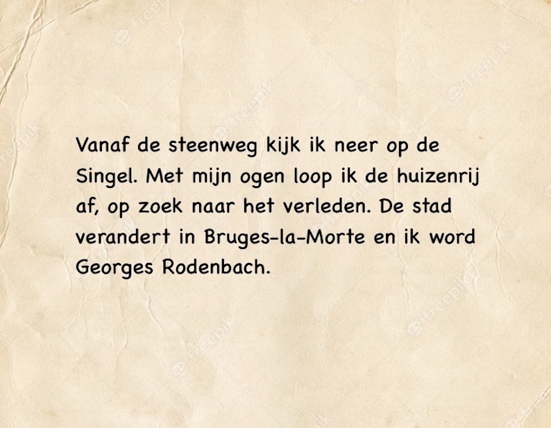 189 — Singel — Vanaf de steenweg kijk ik neer op de Singel. Met mijn ogen loop ik de huizenrij af, op zoek naar het verleden. De stad verandert in Bruges-la-Morte en ik word Georges Rodenbach.