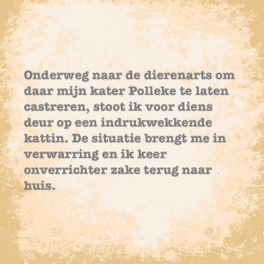 149 — Verwarring — Onderweg naar de dierenarts om daar mijn kater Polleke te laten castreren, stoot ik voor diens deur op een indrukwekkende kattin. De situatie brengt me in verwarring en ik keer onverrichter zake terug naar huis. (Flor Vandekerckhove↗︎)